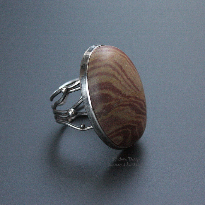 Кольцо из белого металла и тигровой яшмы. Сухие ветви саванны и полоски тигровой шкуры.