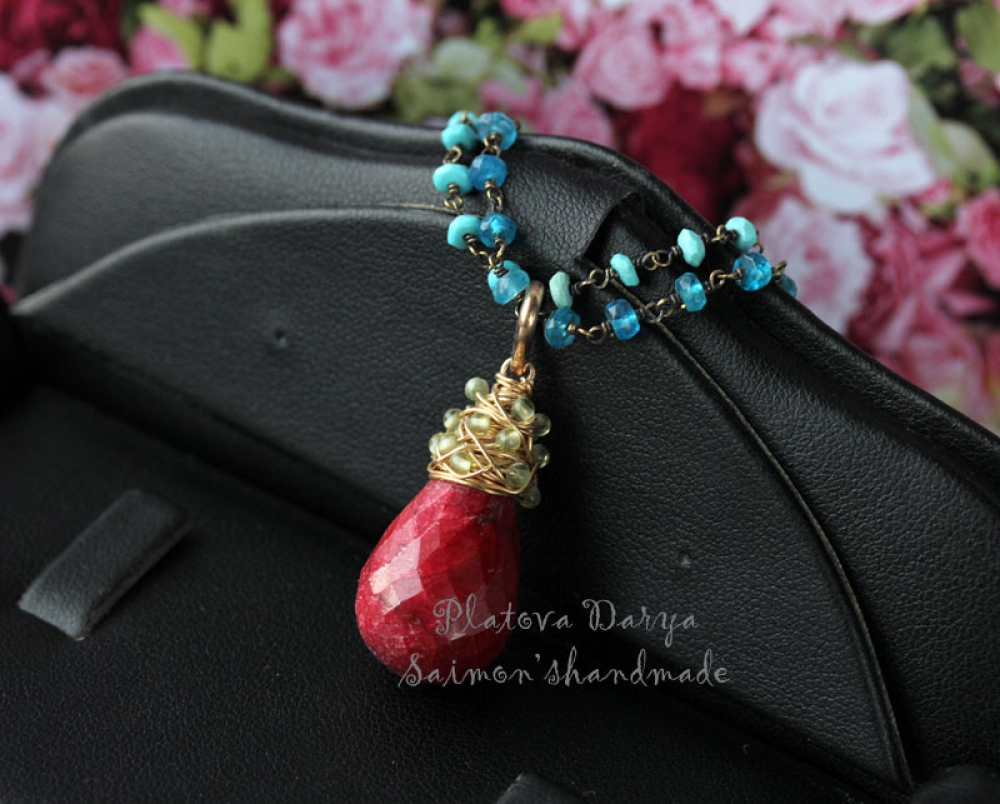 Кулон из крупного каплевидного красного корунда с огранкой и хризолита. Цепочка из натуральной природной бирюзы "спящая красавица" и темно-бирюзовых апатитов.